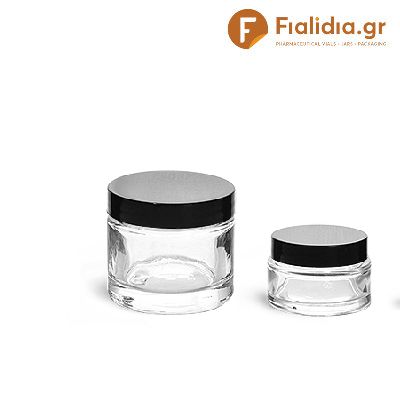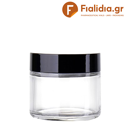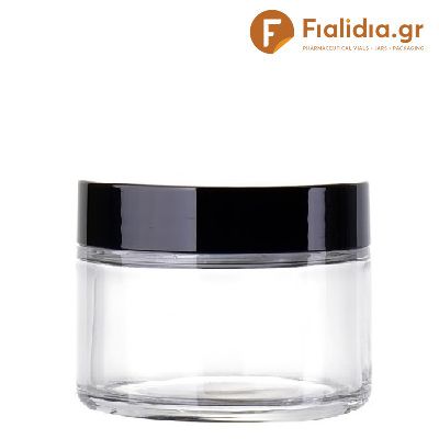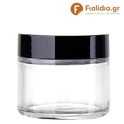 Γυάλινο Βάζο Διάφανο 50ml για Κρέμες και Κηραλοιφές με Μαύρο Γυαλιστερό Καπάκι & Παρέμβυσμα | Συσκευασία 12 τεμαχίων